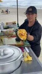 Jeane Lima Reis revelou que a ideia de reinventar o milho de praia surgiu de forma espontânea. “Eu estava em casa, cortei um milho para mim, e eu sempre gosto de comer milho com queijo, azeitona, parmesão, essas coisas. Falei: ‘poxa, que gostoso. Eu vou pôr na areia para vender, quem sabe não dar certo’. Então eu coloquei o milho”, contou a ambulante.