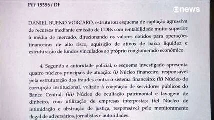 A operação mira uma organização criminosa suspeita de envolvimento em ameaças, corrupção, lavagem de dinheiro e invasão de dispositivos informáticos. A investigação aponta como líderes os mineiros Daniel Vorcaro, dono do Banco Master, e seu cunhado Fabiano Zettel, ambos já detidos em São Paulo.